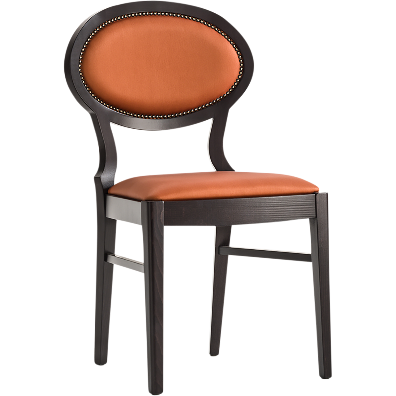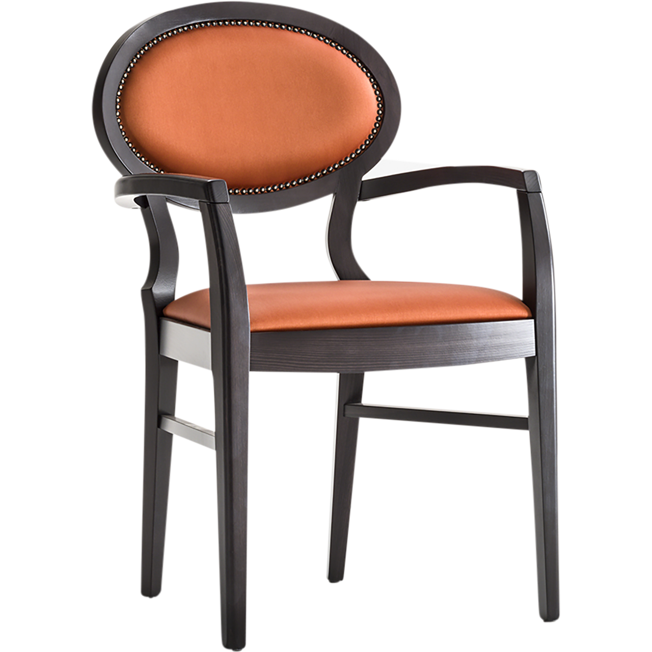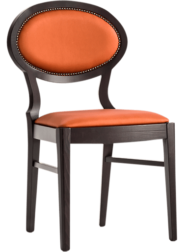 Made with skilled craftsmanship, this family inspired by the Victorian style is characterized by an oval upholstered backrest with refined woodwork to emphasize its elegance. Made in chair, armchair and stool version, it is ideal for refined environments in the contract sector.