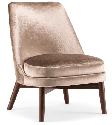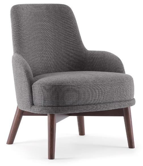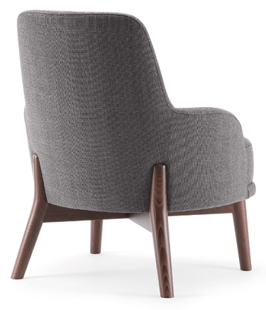 The wooden leg detail, which continues to wrap around the backrest, is characteristic of this lounge chair. The rounded solid beech legs create the characteristic look of the collection, evoking 1970s setting with a modern, minimalist appeal. The seat and backrest can be upholstered in a wide range of fabrics and leathers to further enhance the wooden structure.