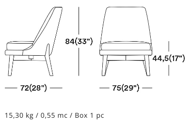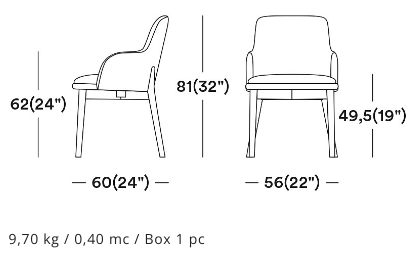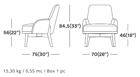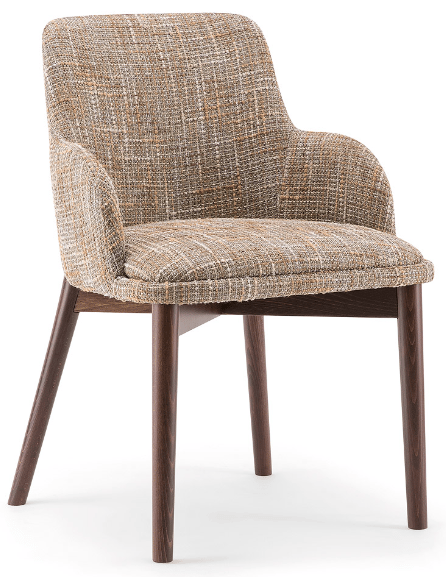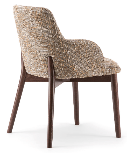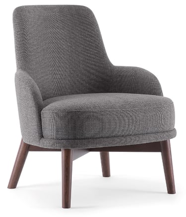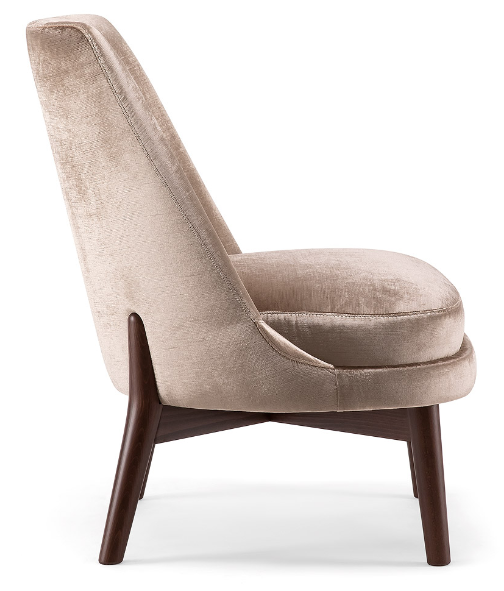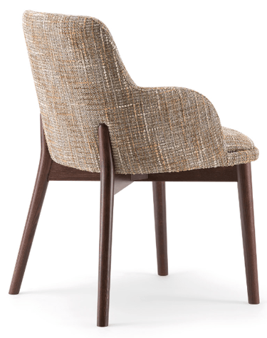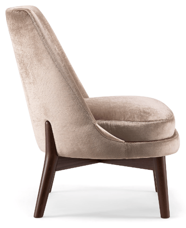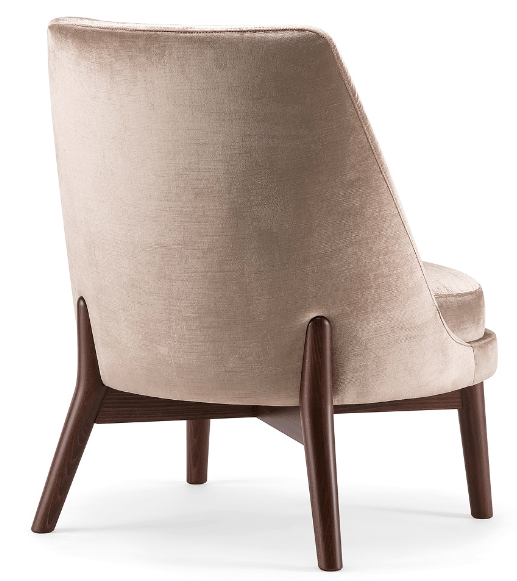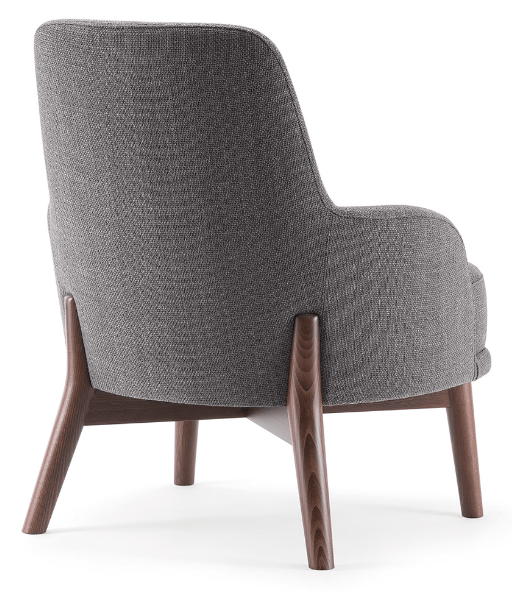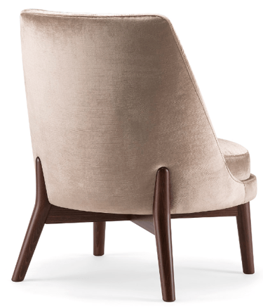 The wooden leg detail, which continues to wrap around the backrest, is characteristic of this armchair. The rounded solid beech legs create the characteristic look of the collection, evoking 1970s setting with a modern, minimalist appeal. The seat and backrest can be upholstered in a wide range of fabrics and leathers to further enhance the wooden structure.