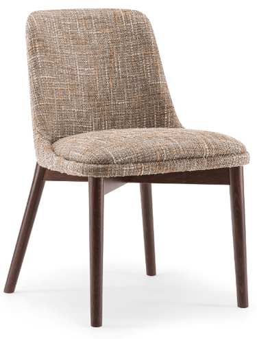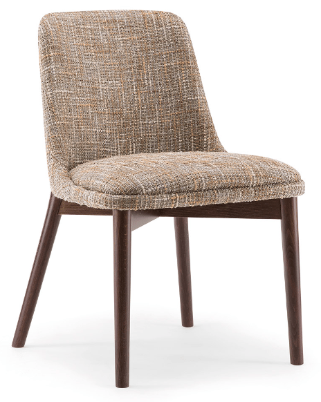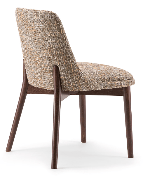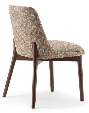 The wooden leg detail, which continues to wrap around the backrest, is characteristic of this side chair. The rounded solid beech legs create the characteristic look of the collection, evoking 1970s setting with a modern, minimalist appeal. The seat and backrest can be upholstered in a wide range of fabrics and leathers to further enhance the wooden structure.