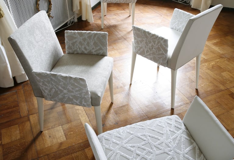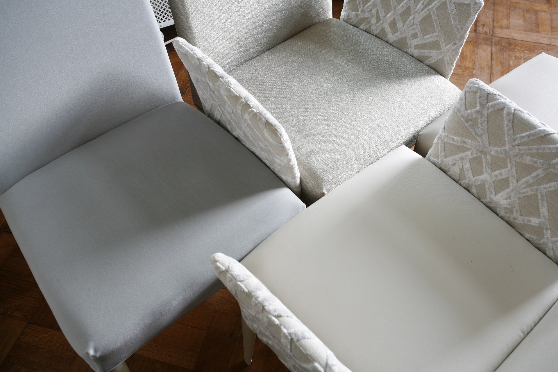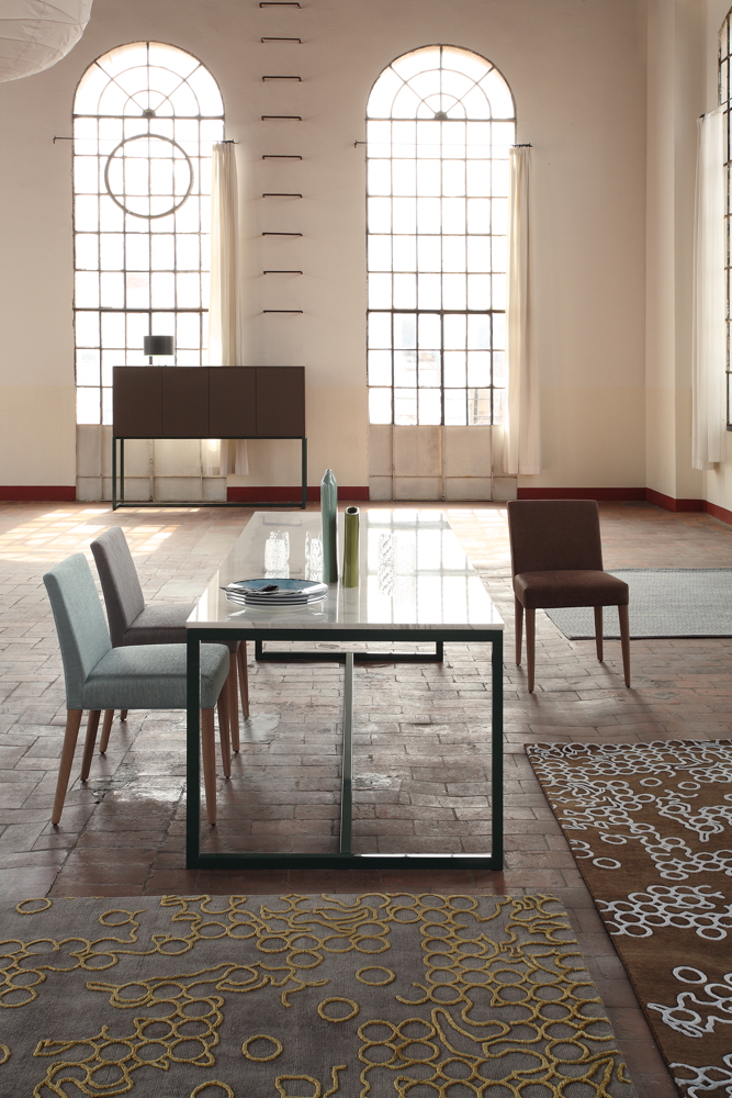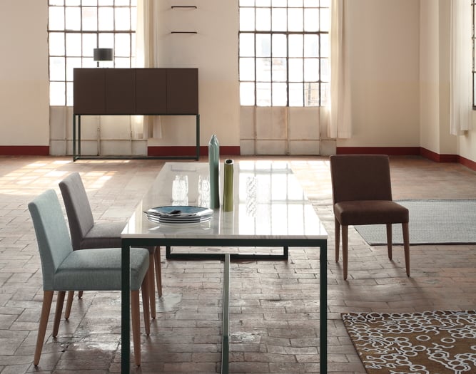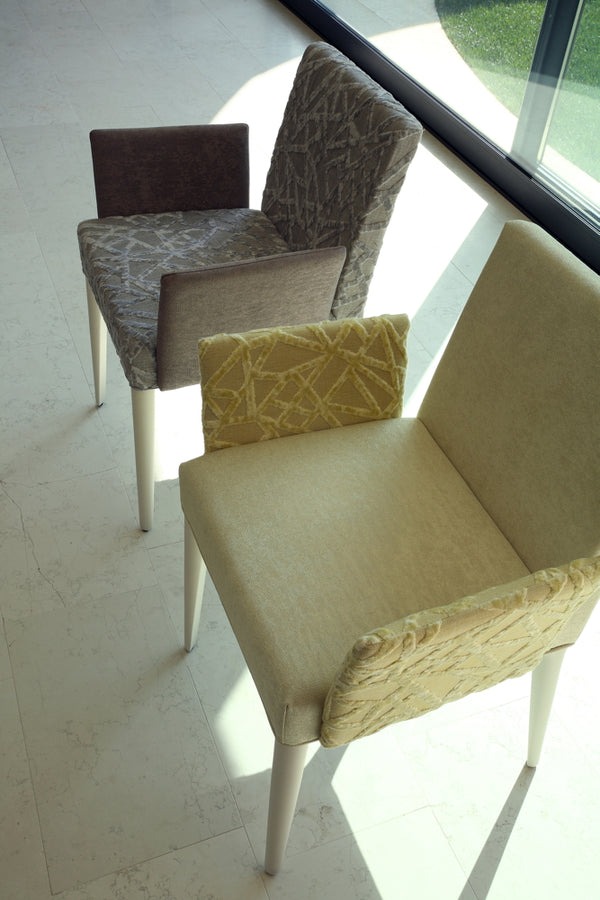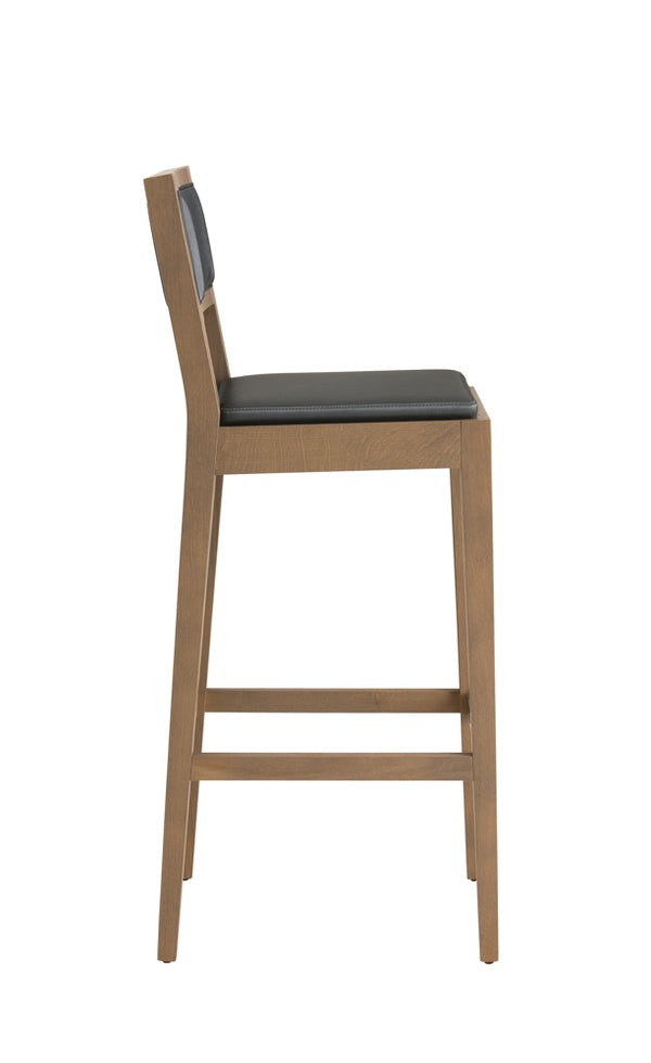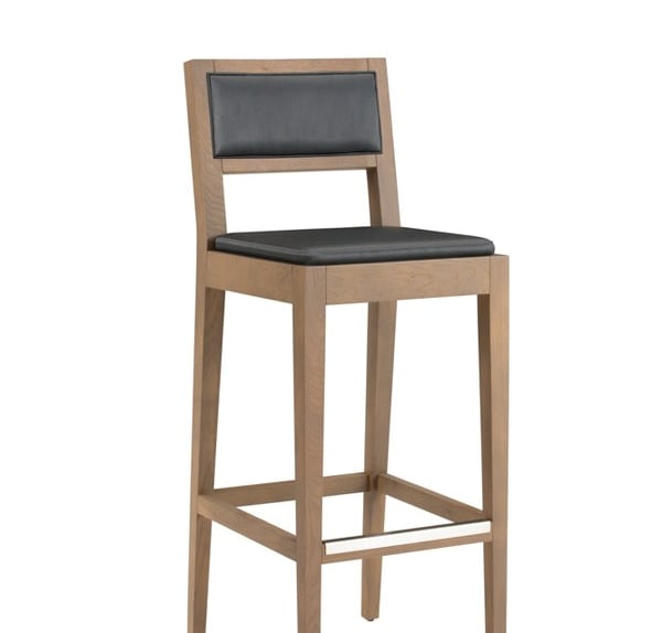Sea set seat with exposed thickness, padded with leather and fabrics. Padded backrest. The footrest is made up of aligned elements and equipped with a wood-protector in stainless steel.