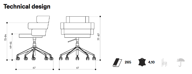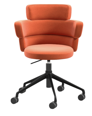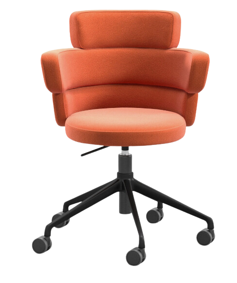 Swivel armchair with height-adjustable base, polished or painted aluminum 5-spoke and upholstered seat and tall backrest with flame-retardant polyurethane foam.