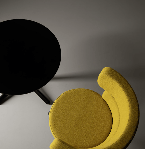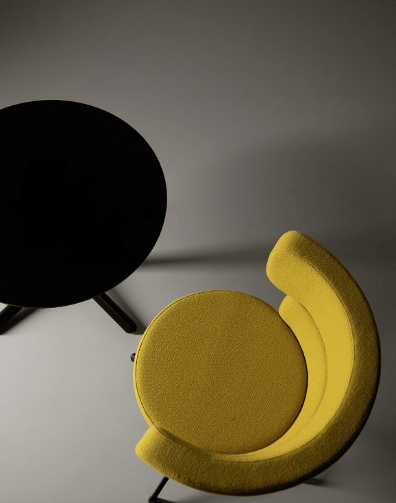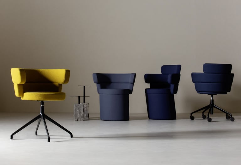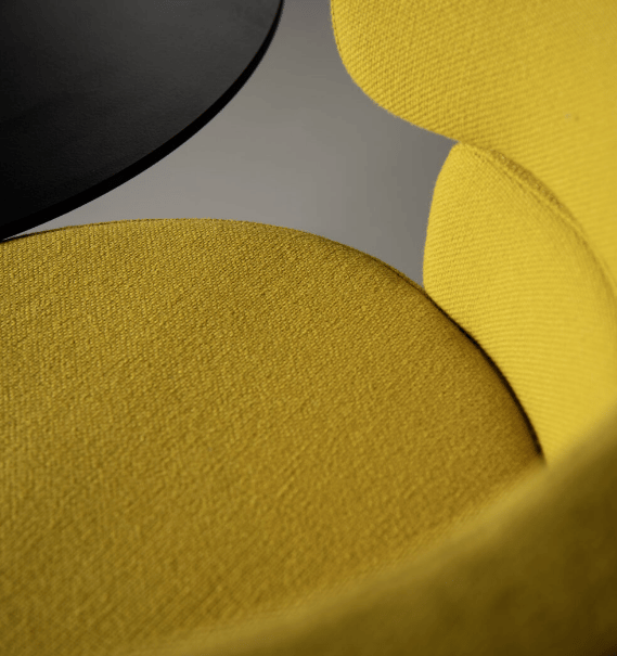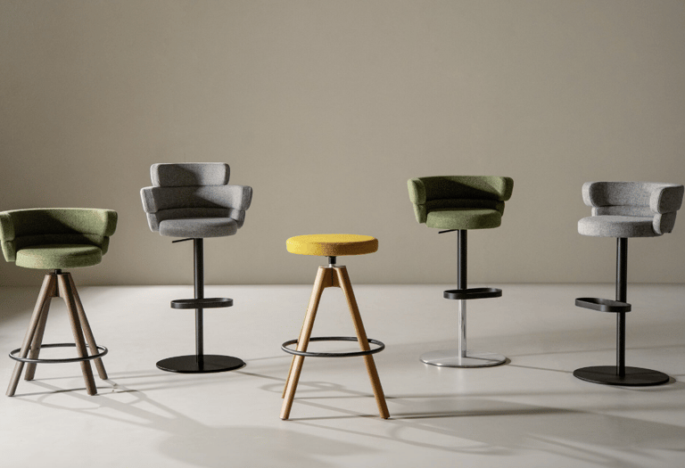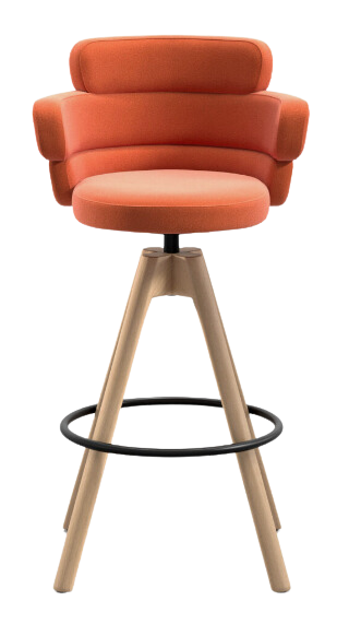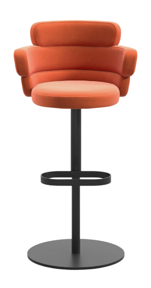 Self-aligning swivel stool with monochromatic frame and upholstered shell with flame-retardant polyurethane foam. Stool base: Ø 45 cm.