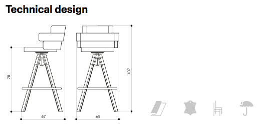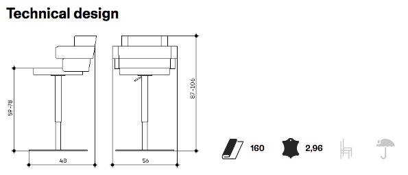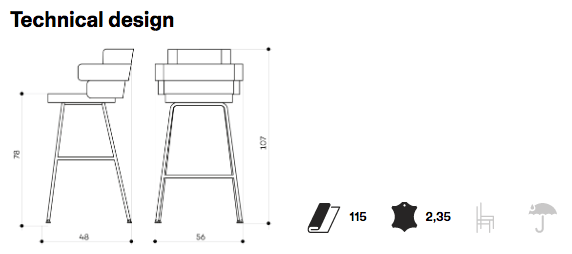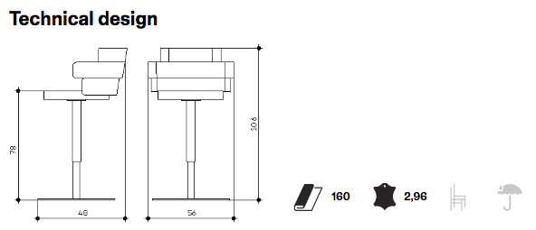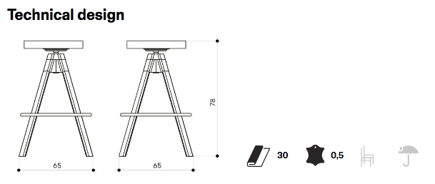 Swivel and height adjustable stool. Diam 45 brushed steel base with chromed footrest, painted footrest. Avaiable also monochrome base. Beech plywood seat and backrest with flame-retardant polyurethane foam, upholstered.