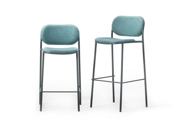 Stool with painted metal structure, upholstered seat and back. With customisable upholstery options for seats and backrests, Denver brings coordination to different interior spaces, while ensuring every room has its own personality and textures.