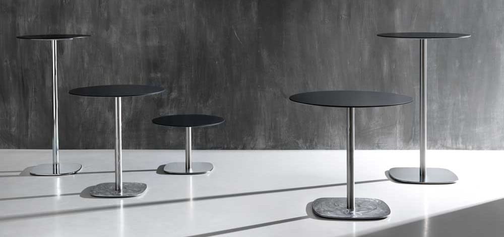 Diego base 530 features a thin column and a flat base, it was thus created to match the new contemporary minimal style. The 530 base with both round plate and column is available in 3 standard heights and can be combined with tops of different sizes and finishes.