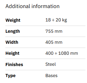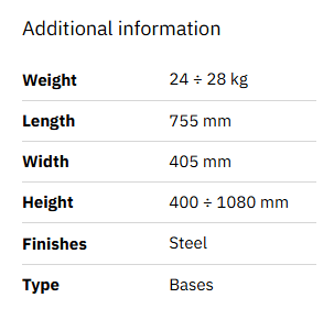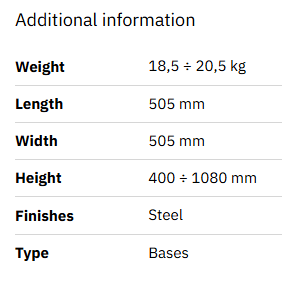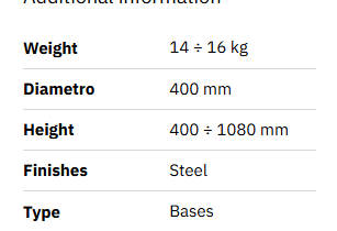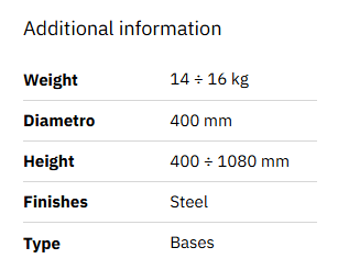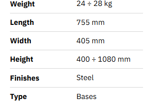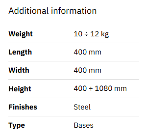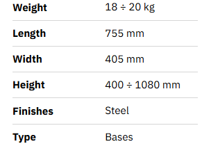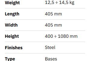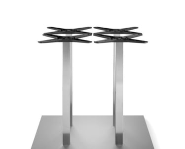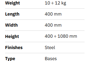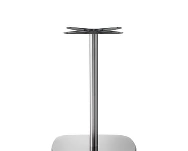 Stainless Steel base with 4 ABS feet. Provided with pcast iron counterweight painted with epoxy powder and our die-cast aluminum “Star” top fixing cross. Suitable for different shapes and colors tops, its elegant line and regular proportions make it very versatile for contract use and perfect for many spaces as restaurants, bistro, bars, pubs, cafès…