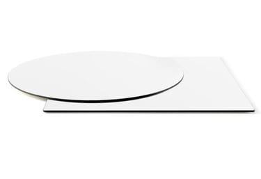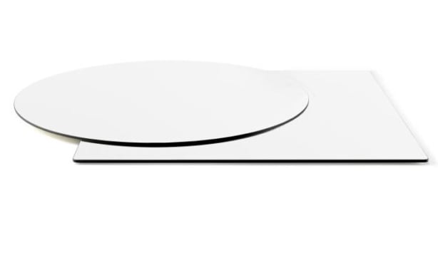 Laminated top in white HPL characterized by a material of excellent quality and easy to maintain and clean, suitable for indoor and outdoor use, which is well suited to different contract contexts.