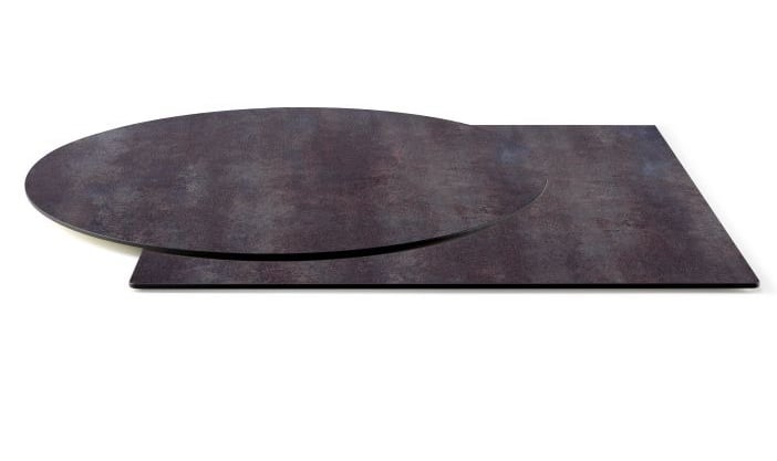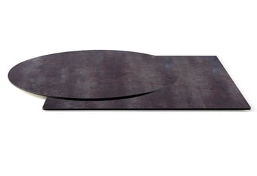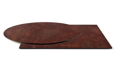 Laminated top in corten HPL characterized by a material of excellent quality and easy to maintain and clean, suitable for indoor and outdoor use, which is well suited to different contract contexts.