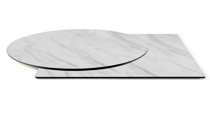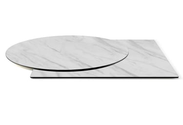 Laminated top in carrara marble HPL characterized by a material of excellent quality and easy to maintain and clean, suitable for indoor and outdoor use, which is well suited to different contract contexts.
