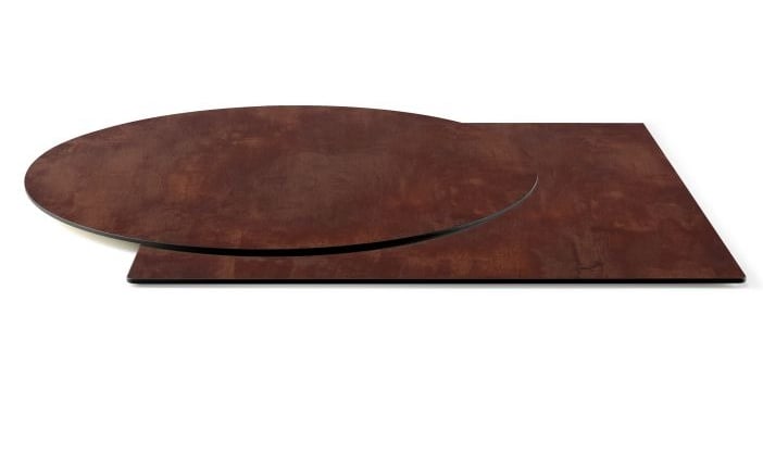 Laminated top in rust HPL characterized by a material of excellent quality and easy to maintain and clean, suitable for indoor and outdoor use, which is well suited to different contract contexts.