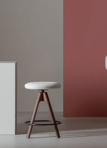 Swivel and self-aligning stool. Chromed or painted frame. Diam. 45 cm base. Beech plywood seat and backrest with flame-retardant polyurethane foam, upholstered.