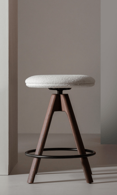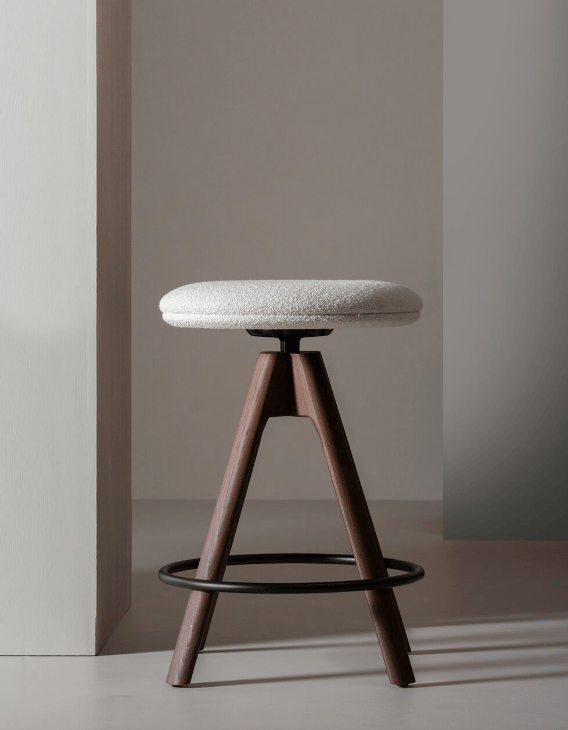Swivel stool with solid ash 4-Legs frame, beech plywood seat with flame-retardant polyurethane foam, upholstered and black-painted steel footrest.