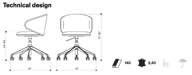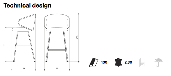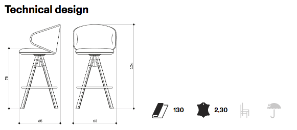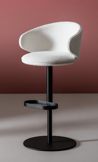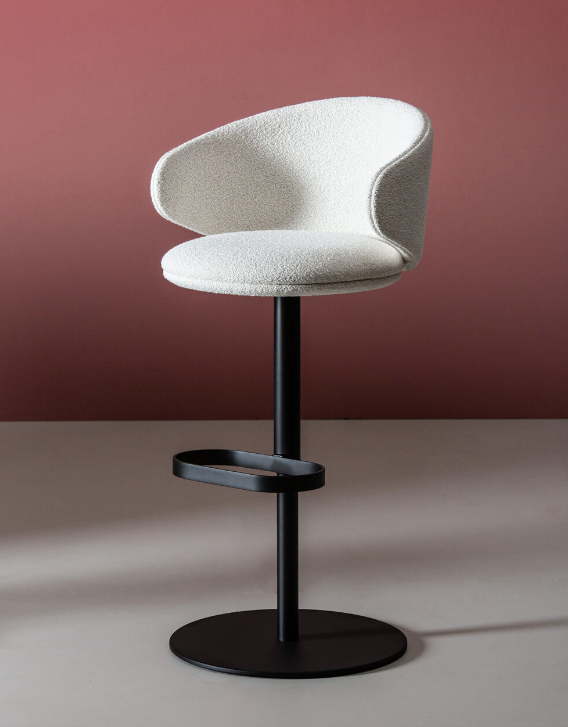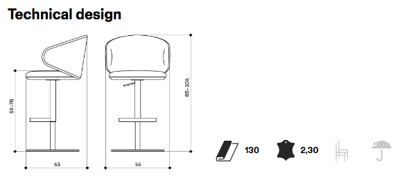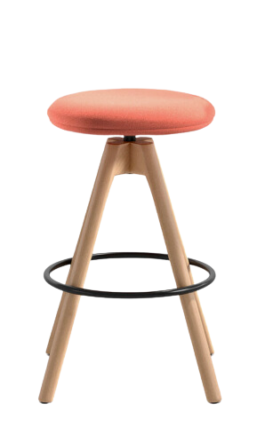 Swivel and heght adjustable stool with stainless steel base, steel footrest, beech plywood seat and backrest with flame-retardant polyurethane foam, upholstered. Stool base: Ø45 cm. Also available with monochrome frame.