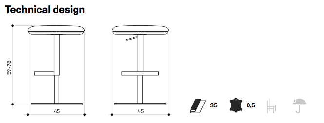 Swivel and heght adjustable stool with stainless steel base, steel footrest, beech plywood seat with flame-retardant polyurethane foam, upholstered. Stool base: Ø45 cm. Also available with monochrome frame.