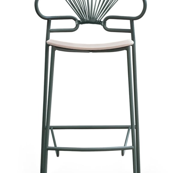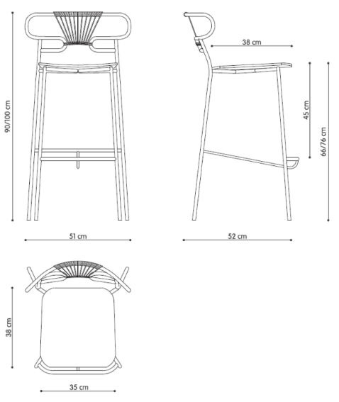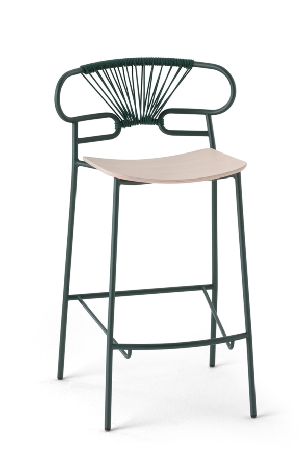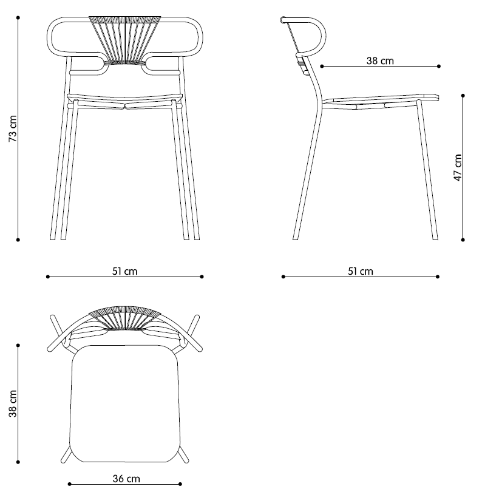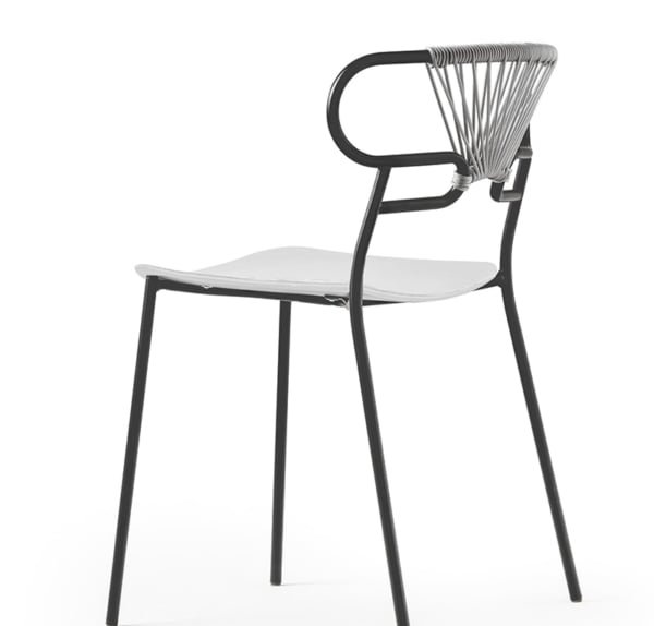 Stackable structure in painted metal or in polished chrome, polished black chrome, polished brass, seat in ash, back with colored rope weaving. The distinguishing element is the ‘one-line’ backrest, obtained by curving a single metal tube which - with its virtually endless wavy line, also extended to the armrests in this new version - is an elegant addition to every space, bringing a sense of lightness.