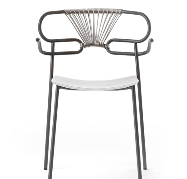 Stackable structure with armrests in painted metal or in polished chrome, bright black chrome, polished brass, seat in ash, back with colored rope weaving. The distinguishing element is the ‘one-line’ backrest, obtained by curving a single metal tube which - with its virtually endless wavy line, also extended to the armrests in this new version - is an elegant addition to every space, bringing a sense of lightness.