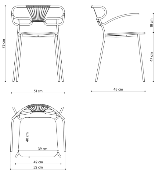 Structure in painted metal or in polished chrome, polished black chrome, polished brass, seat in ash, back with colored rope weaving. The characterizing element is the 'one line' backrest, obtained from the curvature of a single metal tube which - with its virtually infinite sinuous line, extended into this new version in the armrests - fits discreetly into any space, connoting it with lightness.