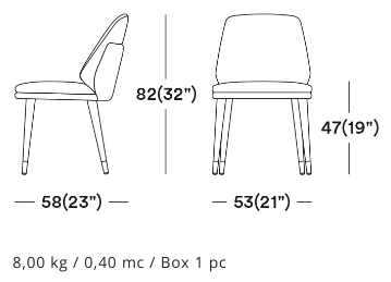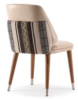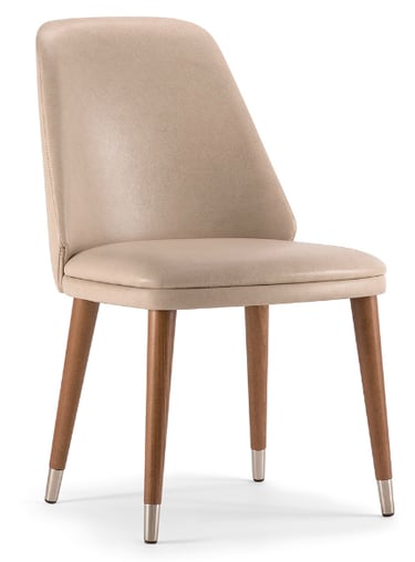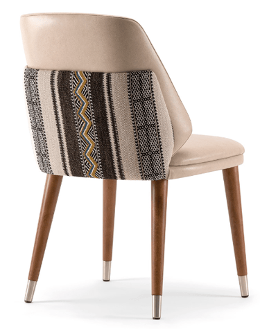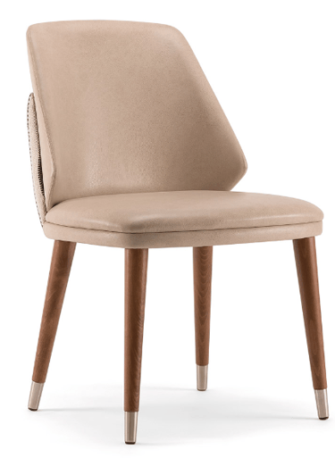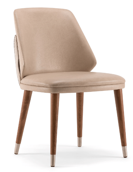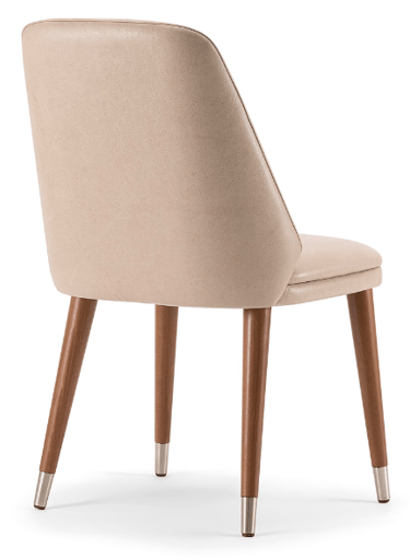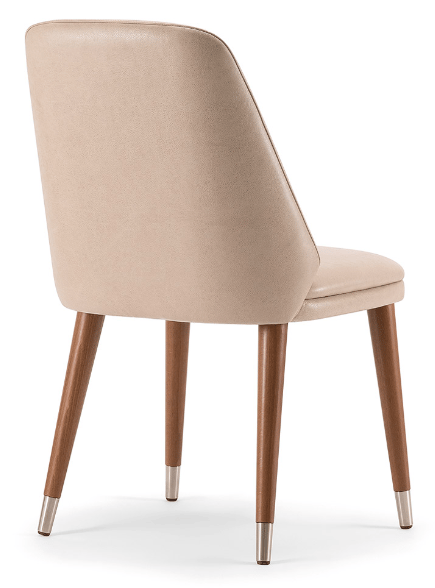 The backrest is kite like in its appearance with a distinctive back panel that can be upholstered in a contrasting material. Wooden legs with trendy metal slipper cups can be made in a variety of finishes, while the upholstery can be customised to suit different restaurant, hotel or bar projects.