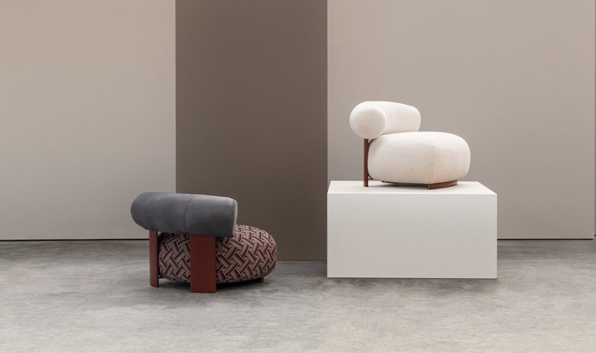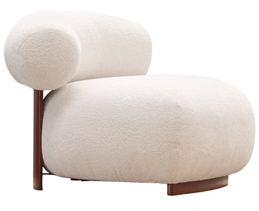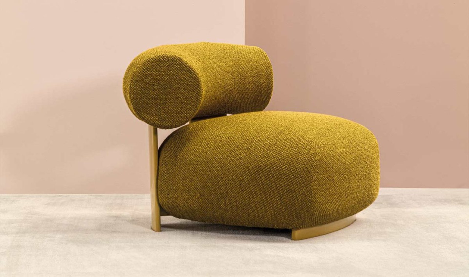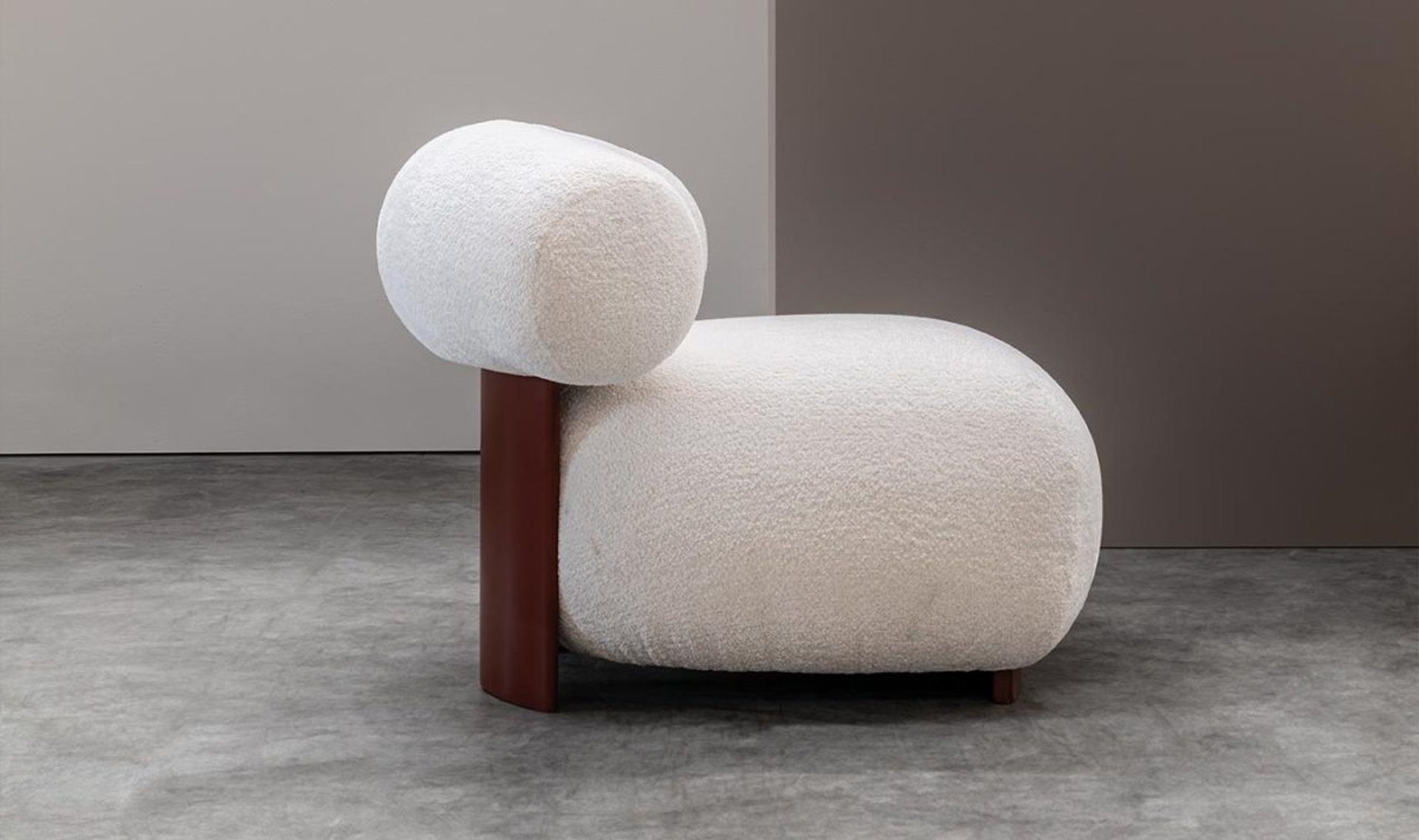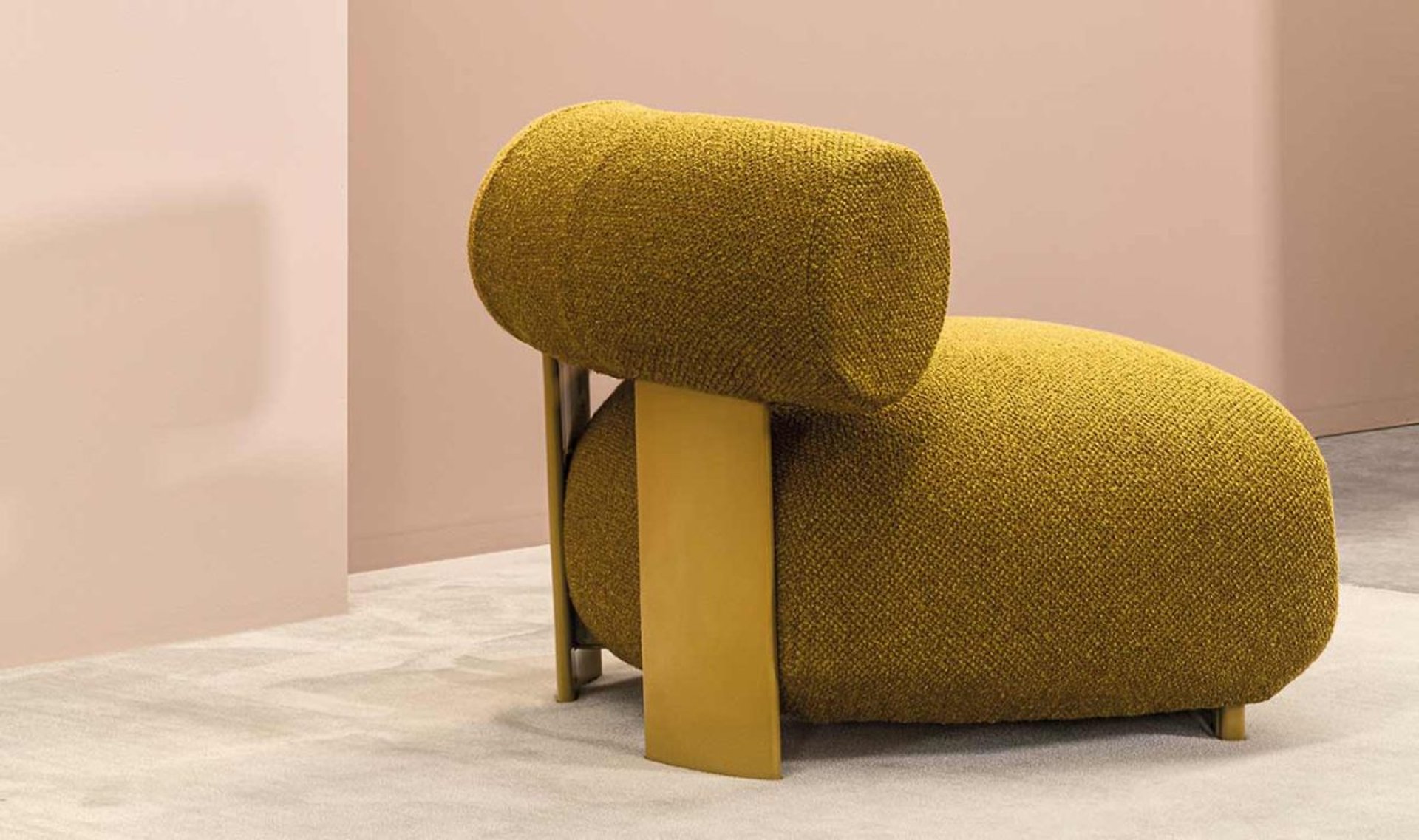 Lounge armchair with iconic rounded shapes and minimal, conceptual volumes, immediately perceivable. The large seat, reminiscent of a stone polished and sculptured by time, is connected to the enveloping backrest by two vertical elements.