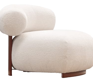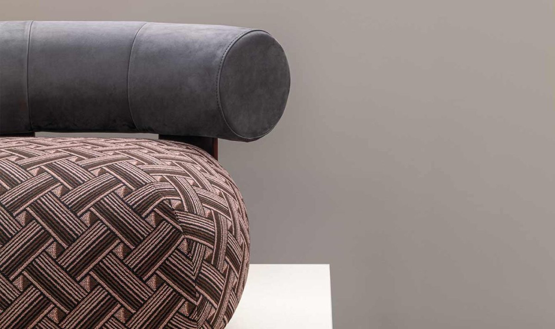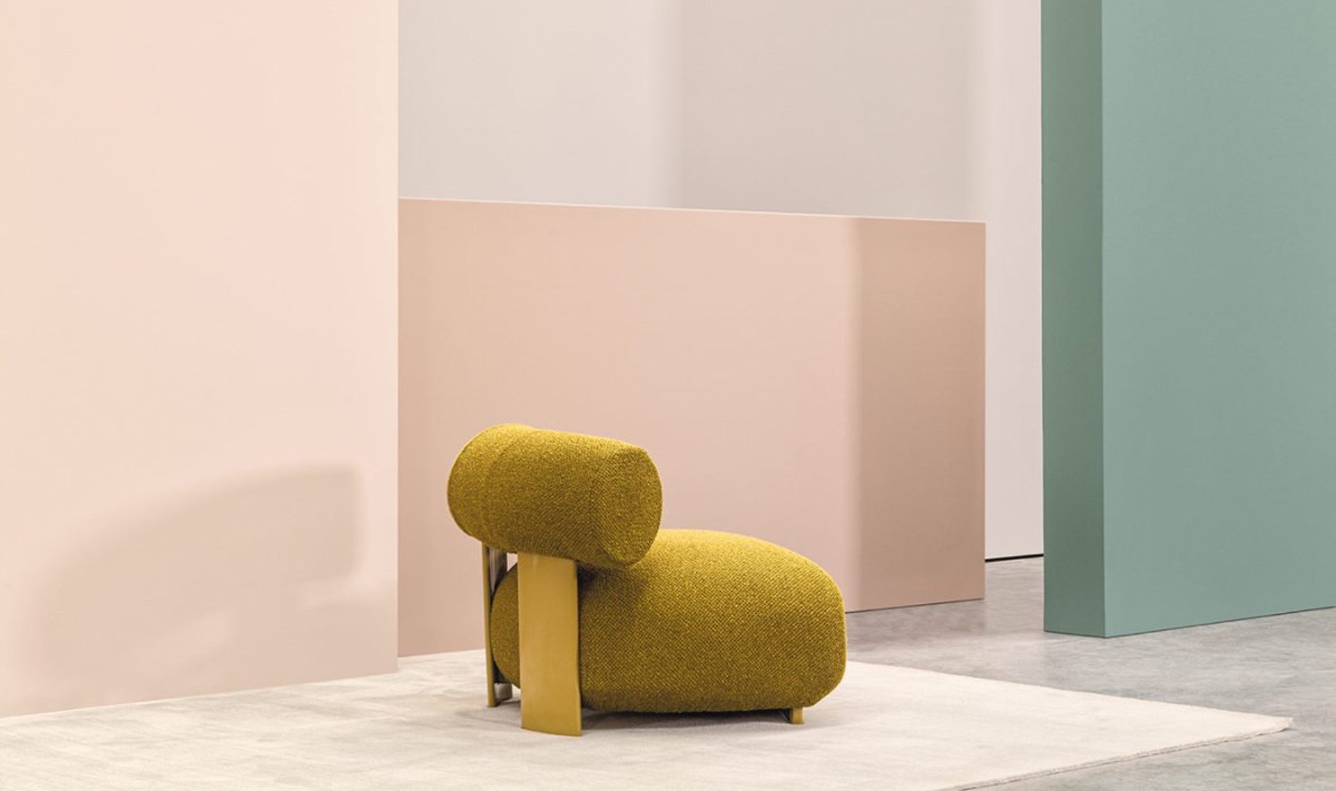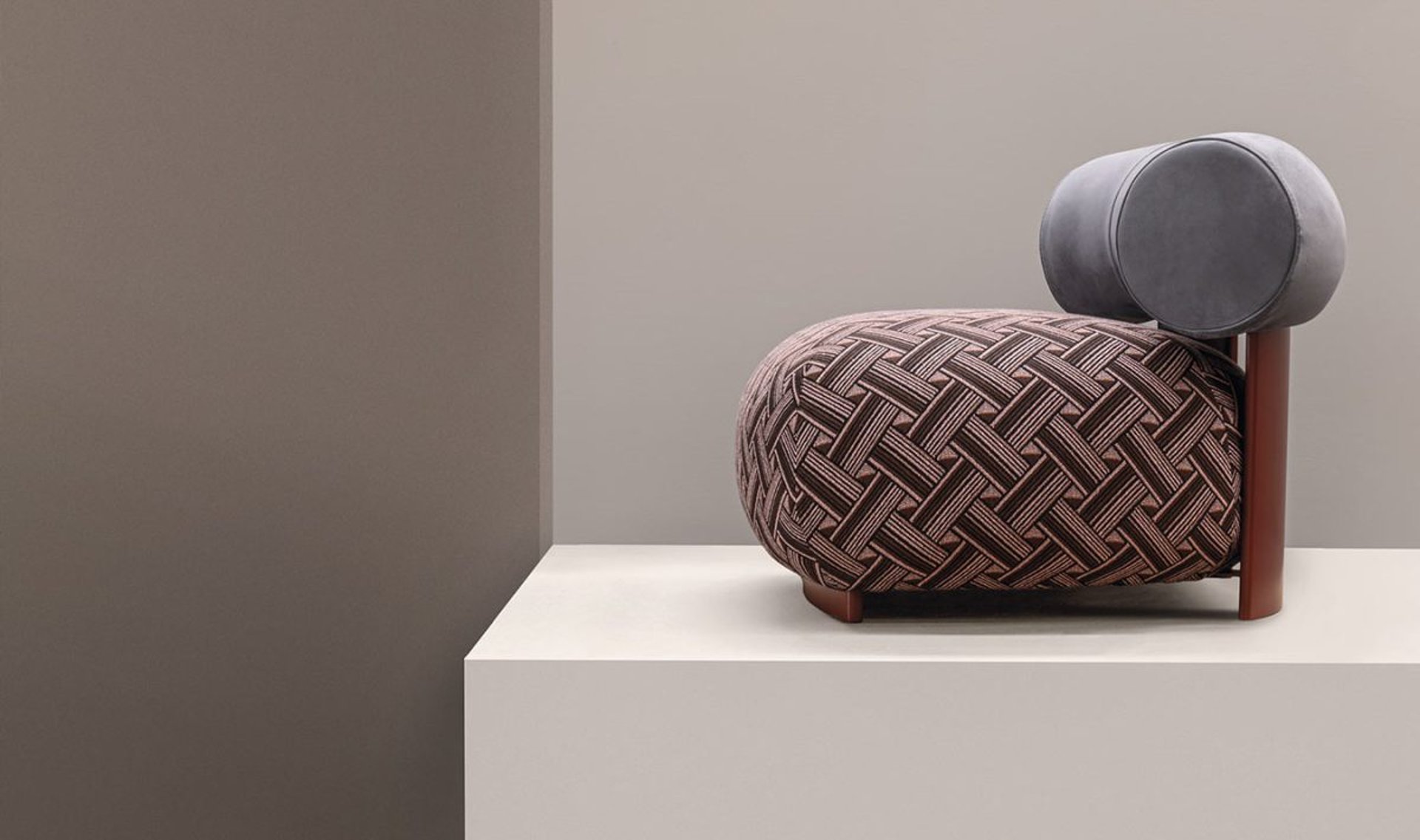 Lounge armchair with iconic rounded shapes and minimal, conceptual volumes, immediately perceivable. The large seat, reminiscent of a stone polished and sculptured by time, is connected to the enveloping backrest by two vertical elements.