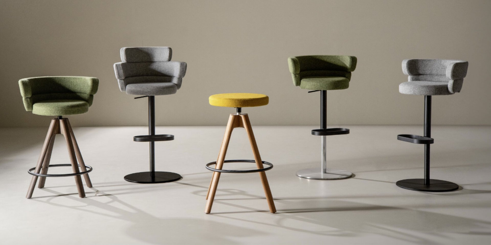 Self-aligning swivel stool with monochromatic frame and upholstered shell with flame-retardant polyurethane foam. Stool base: Ø 45 cm.