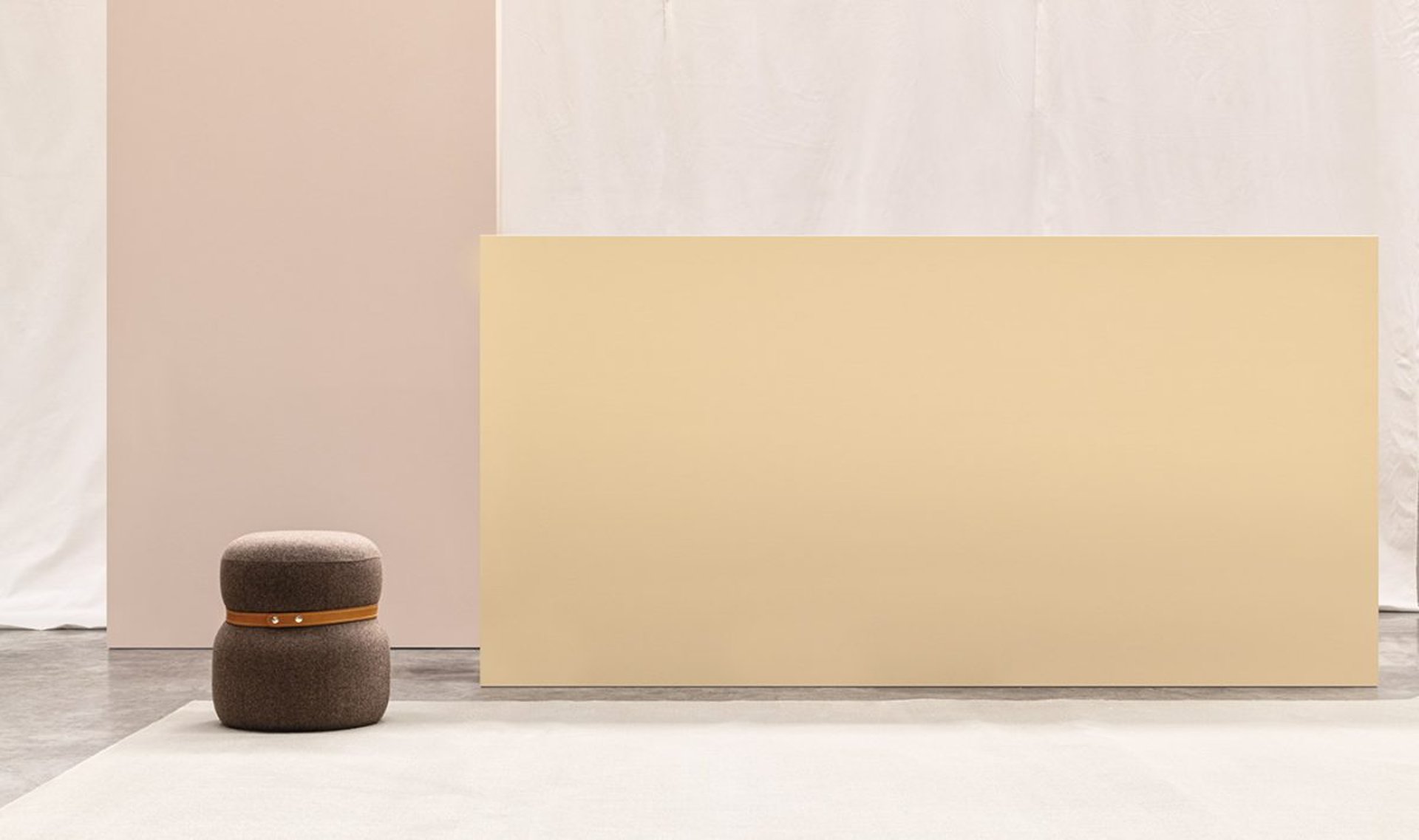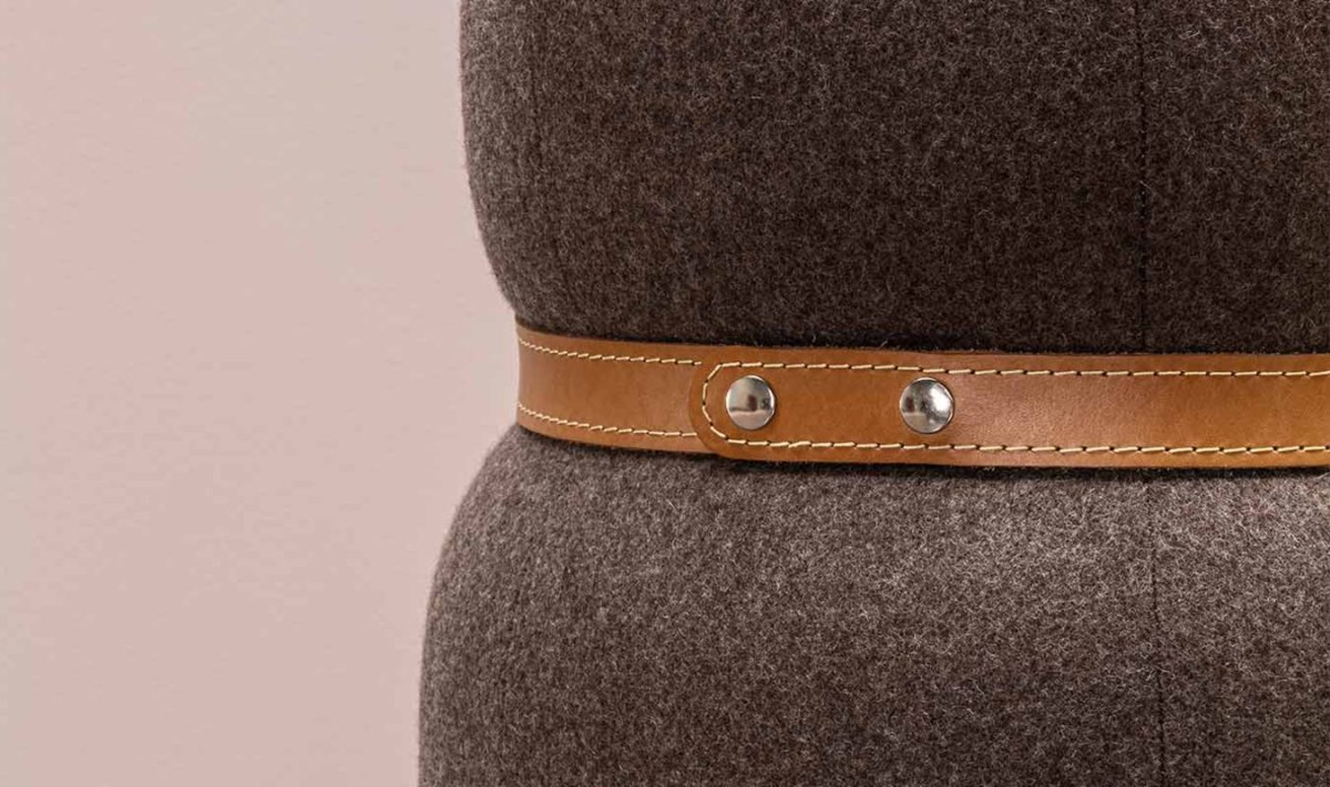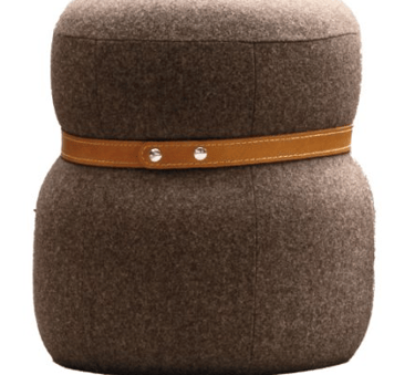 Soft fabric-covered pouf with Toscano full-grain center belt.