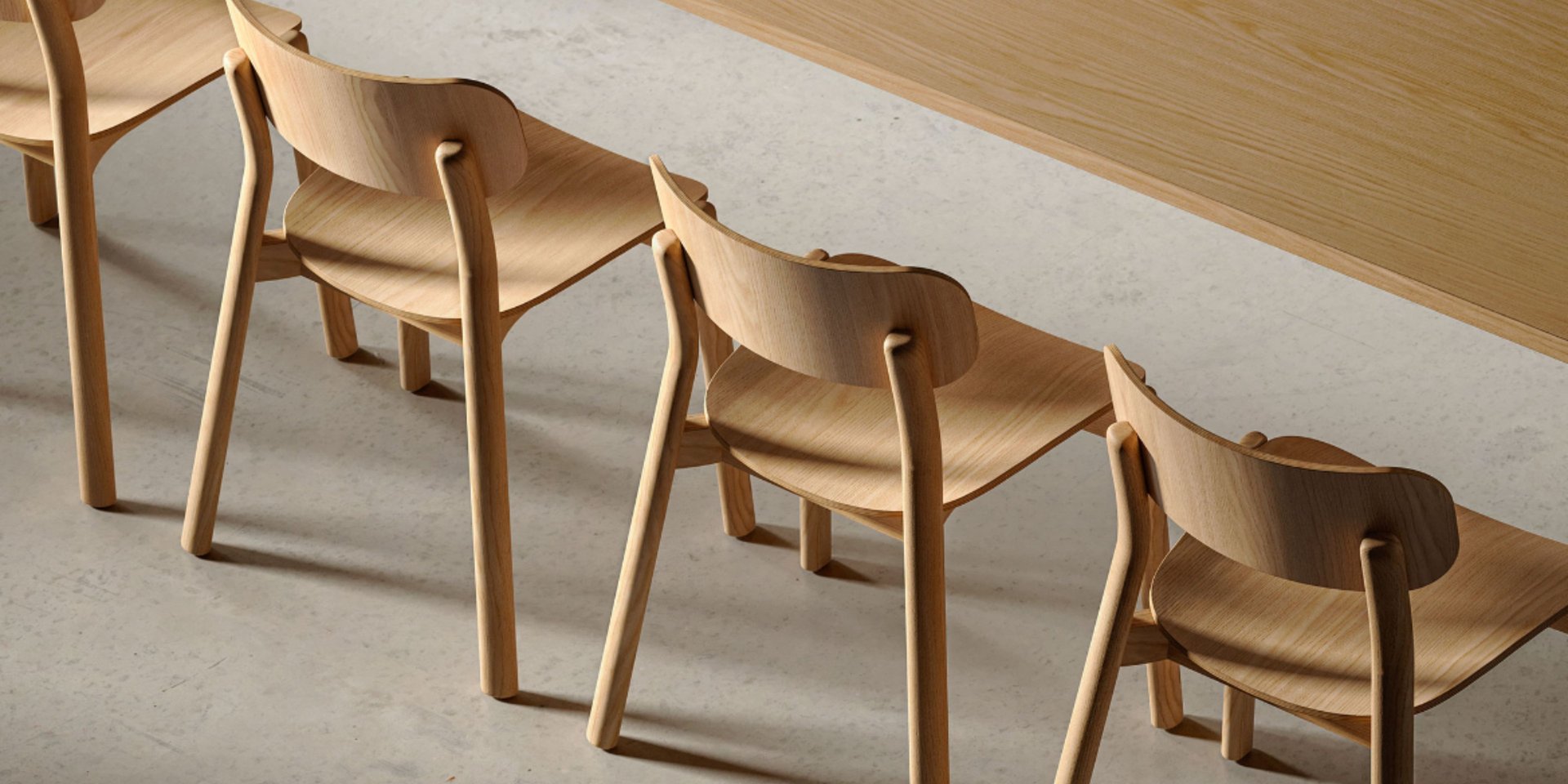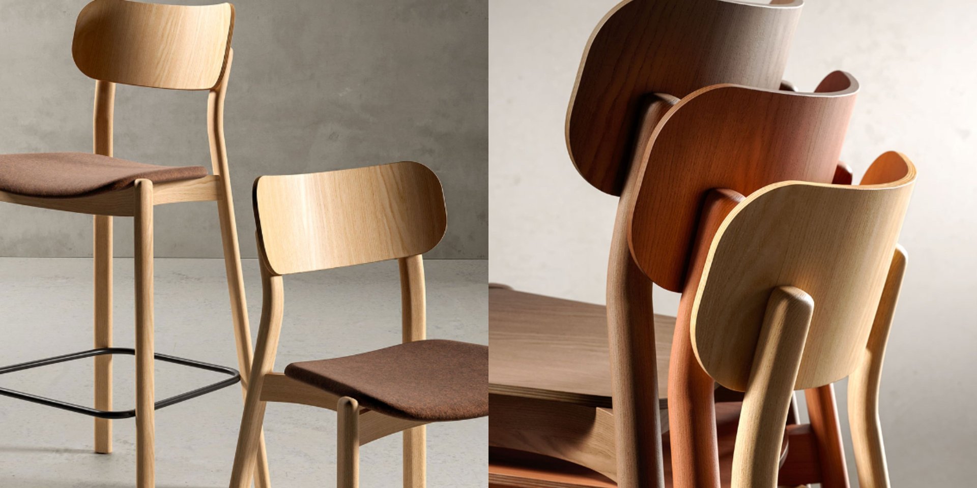 Four-legs chair with painted steel frame and seat and backrest made of painted or open-pore lacquered ash plywood. Available accessory: fixed upholstered cushion.