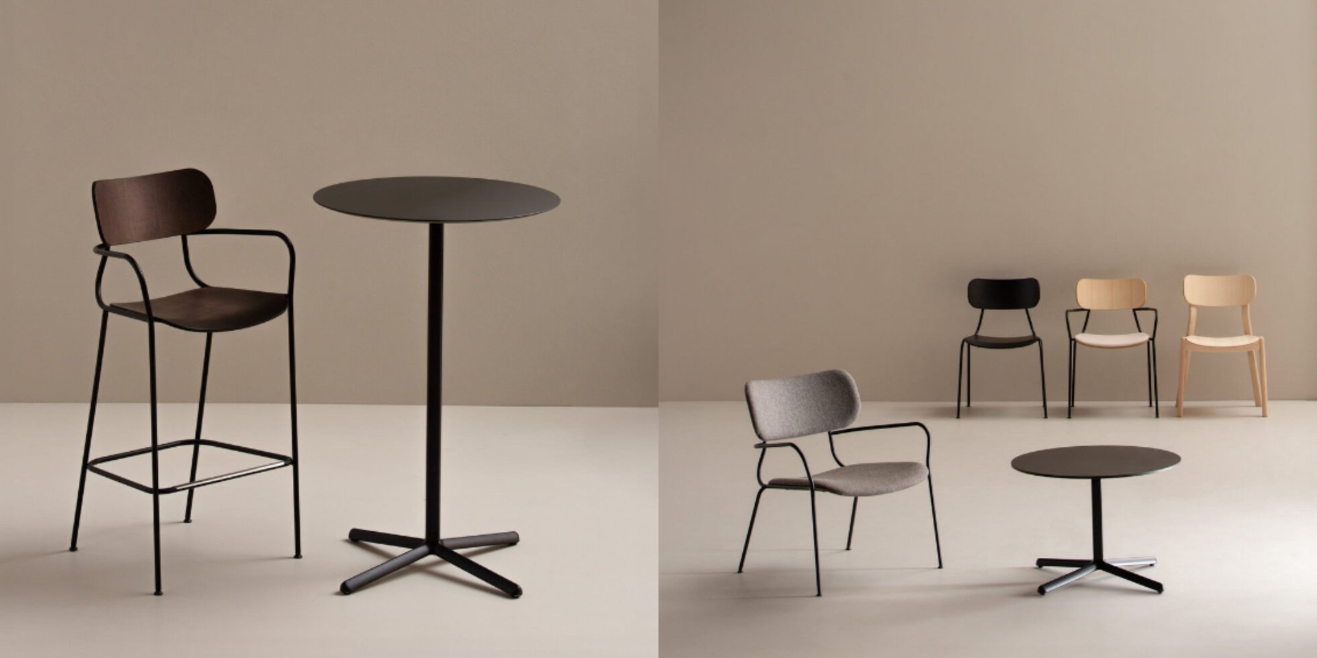 4-legs stool with armrests with painted steel frame and painted or open-pore lacquered ash veneered plywood seat and backrest. Available accessory: upholstered fixed cushion.