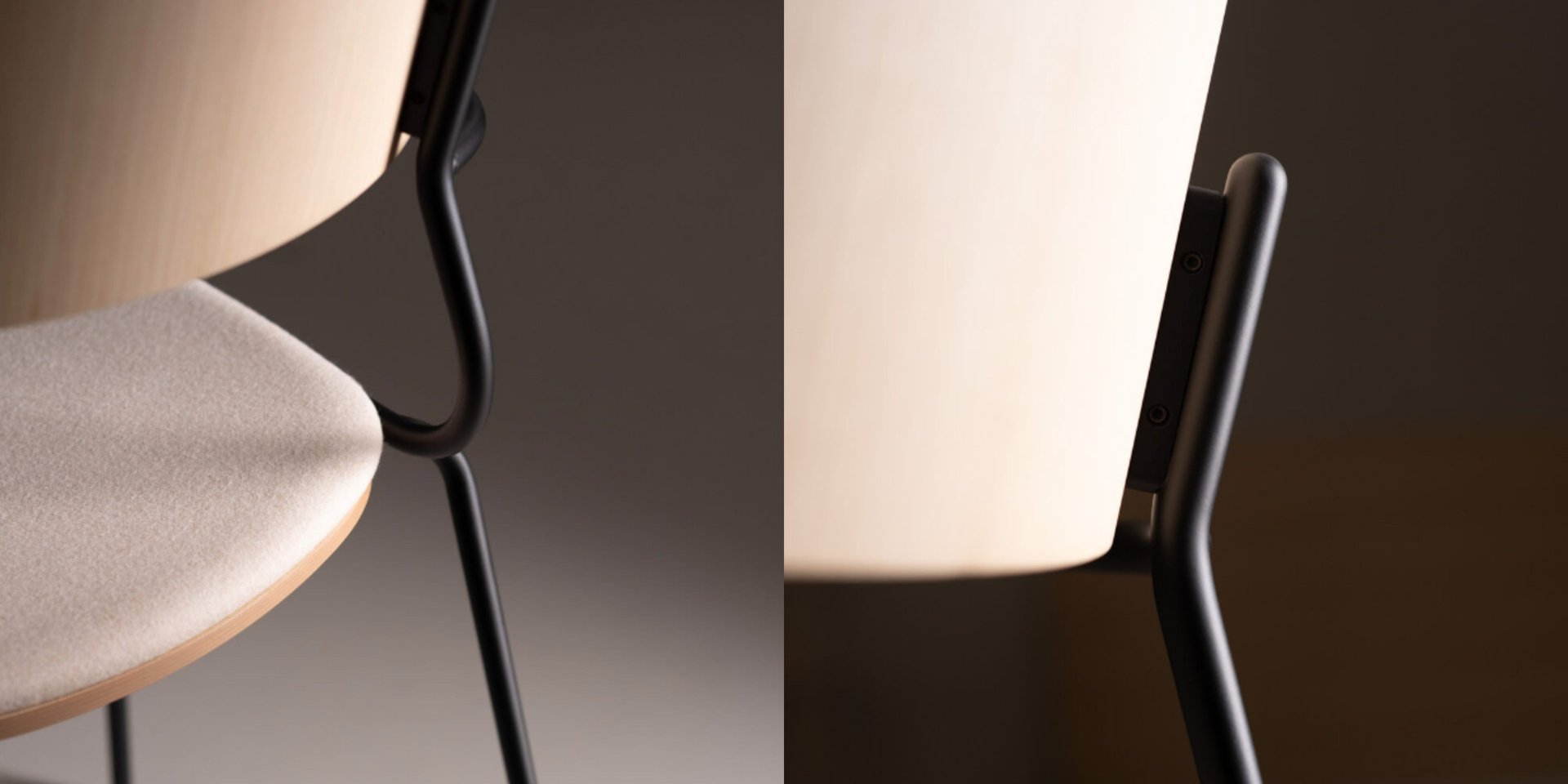 4-legs chair with armrests with painted steel frame and seat and backrest made of painted or open-pore lacquered ash plywood. Available accessory: fixed upholstered cushion.