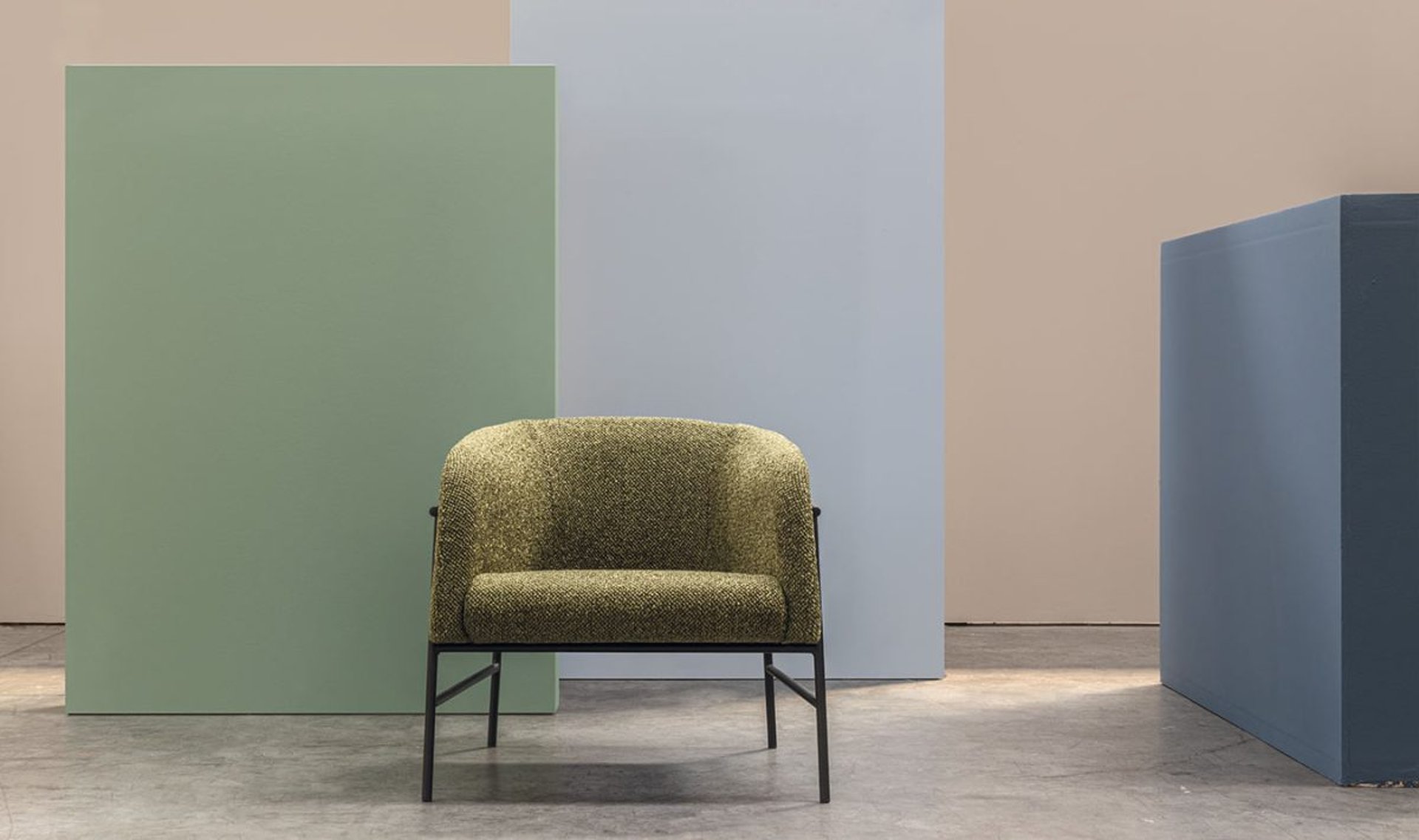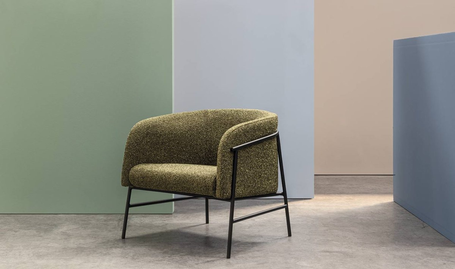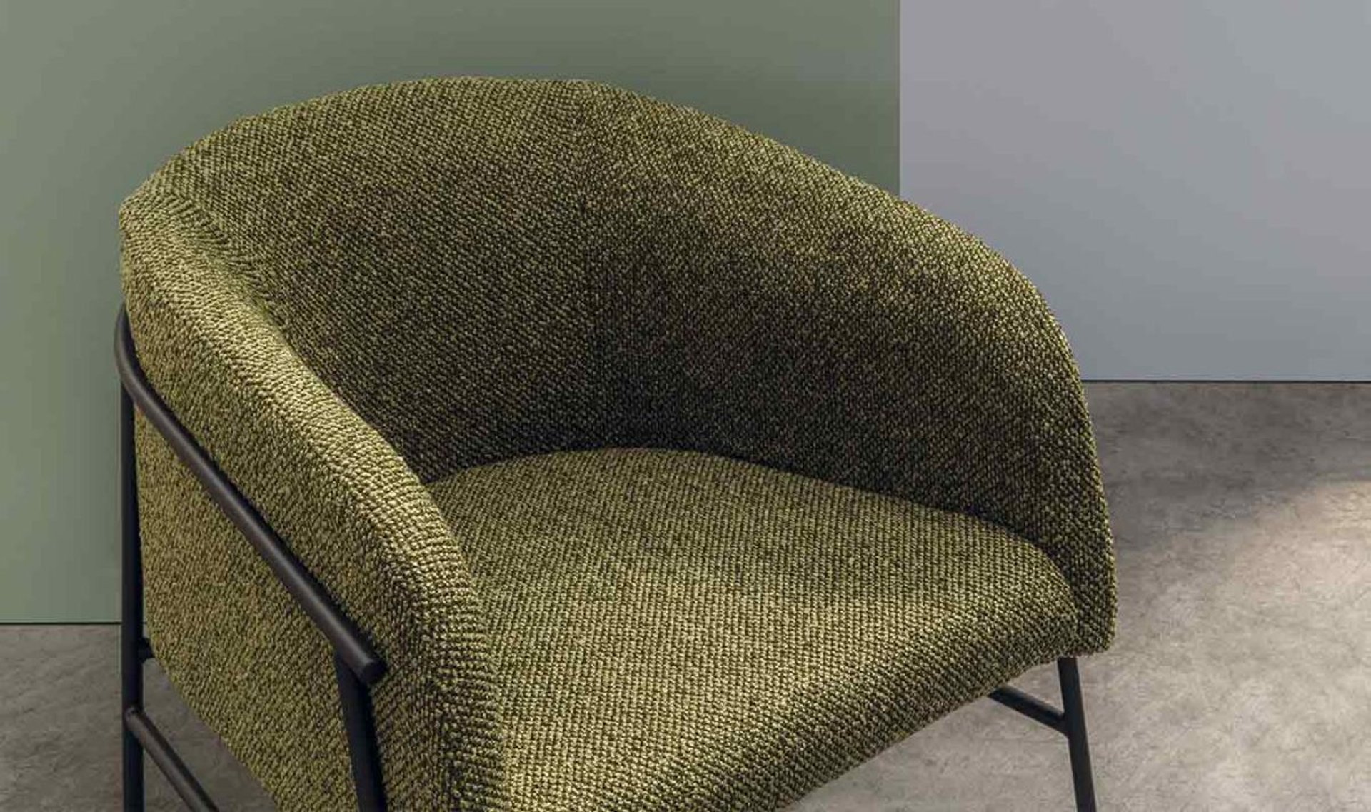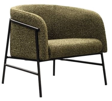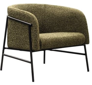 A comfortable and inviting armchair with a tubular iron frame and upholstered in fabrics that amplify its cosiness.